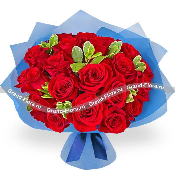 25 роз: роза красная - 25 шт., питтоспорум - 7 шт., упаковка, лента.