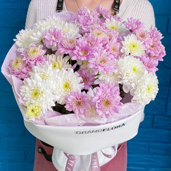 21 хризантем: хризантема кустовая белая - 11 шт., хризантема кустовая розовая  - 10 шт.,  упаковка, лента (возможна замена вида хризанетмы и оттенка розовой хризантемы от светло-розвого до темно-вишневого).